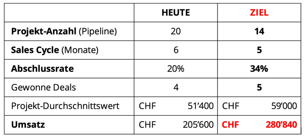 - Du erkennst die quantitativen und qualitativen Hebel und weisst, auf welche relevanten Kunden und Projekte du dich konzentrieren musst.